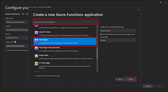 - Choose HTTP Trigger and Azure Function v1 (.Net Framework), then click Create.